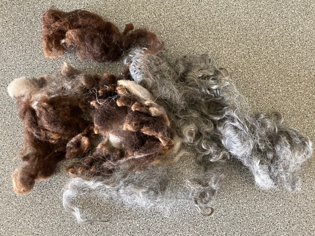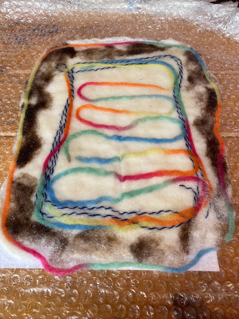 On the 18th July I went to a felt making workshop at Yr Orsaf in Penygroes and Nicole was teaching us. I was feeling nervous because I done felting before, but it was eight years ago. First I brushed pieces of wool with two carding brushes, then I selected bits of wool and yarn and laid them out on some bubble rap. I Nicole gave me a piece of green fabric to cover the wool with and with my hands I covered it in soapy water. After it was wet I rollled it up in the bubble-rap and a tea cloth and rolled it back and forth with my hands,