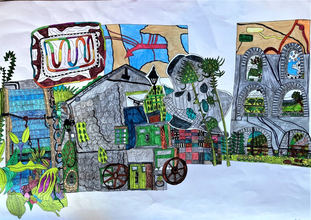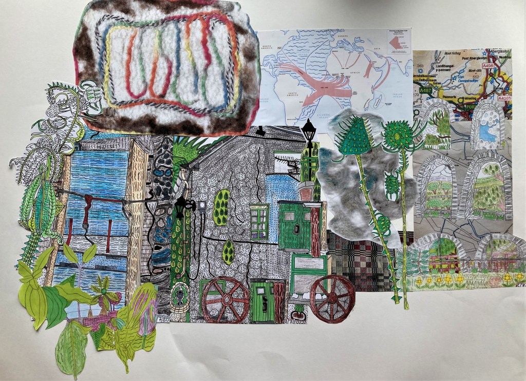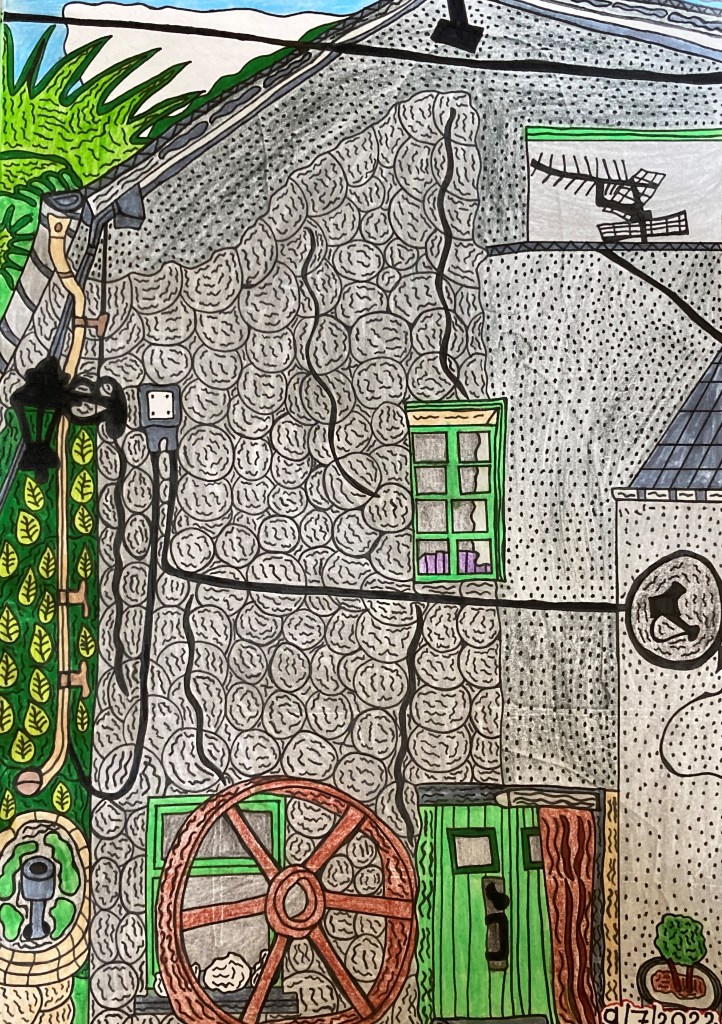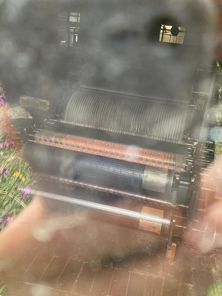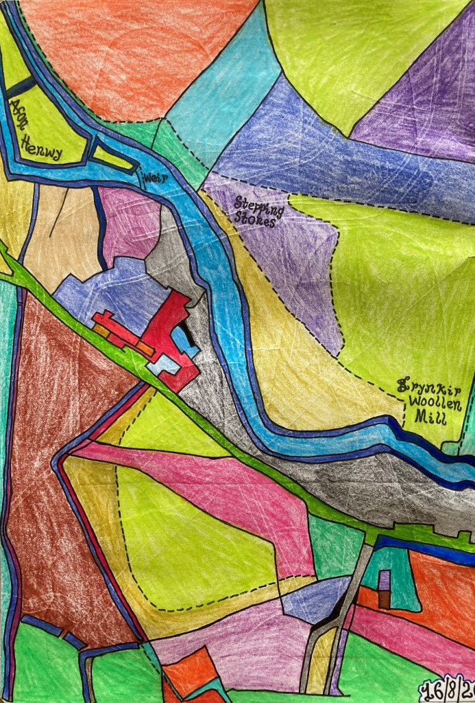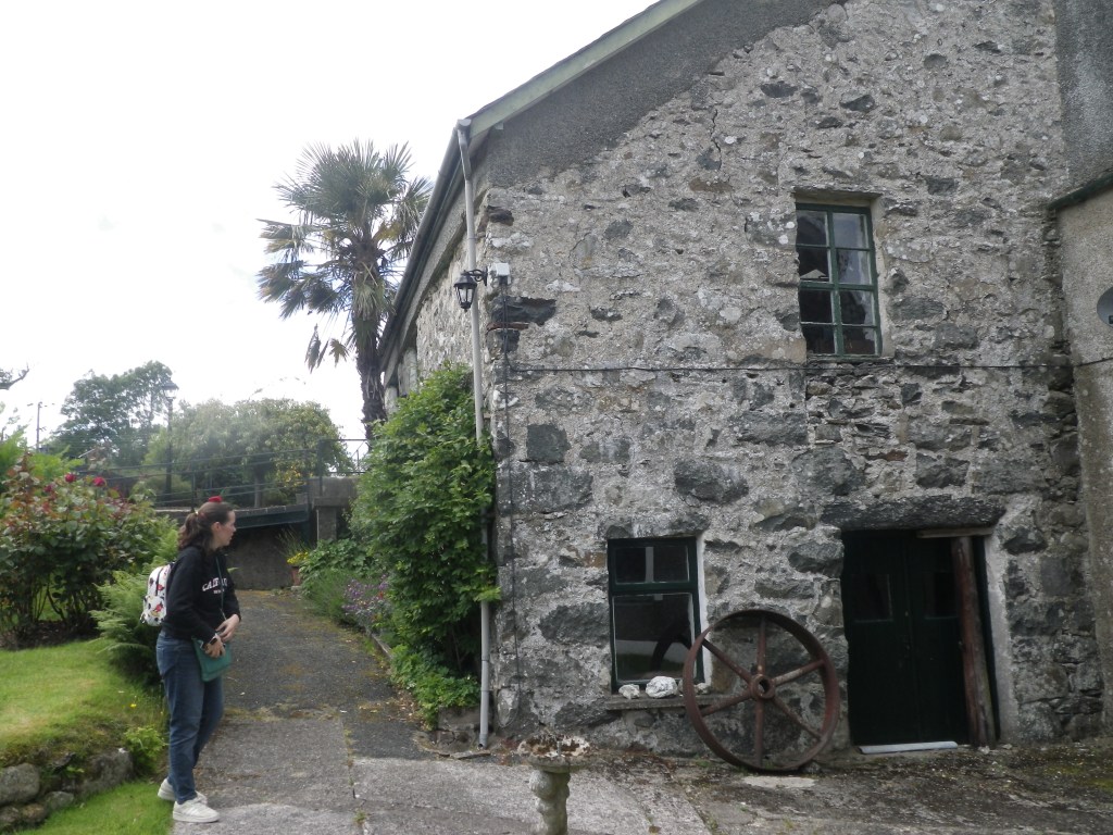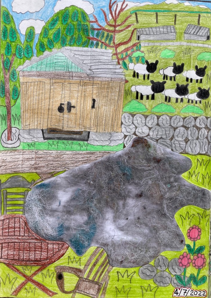 I went on an adventure with Emily to Llangihanngel-y-Pennany near Porthmadog. First we went to see The Brynkir woolen mill to draw it, until a mean lady made us leave. Then Emily chatted to a man who said there was a lady at the cafe who was knowledgable about the valley. On the way we explored the slate slab mill Pandy (where I have been with my family over the years since I was young). I took picture of all the nature objects and creatures and beautiful green trees. Then we went to Cathy’s cafe for a cup of tea and the sheep were being sheared. On our way home at the parish church we came across farmers with wool in big bags, they said it was being taken by the British Wool Board.