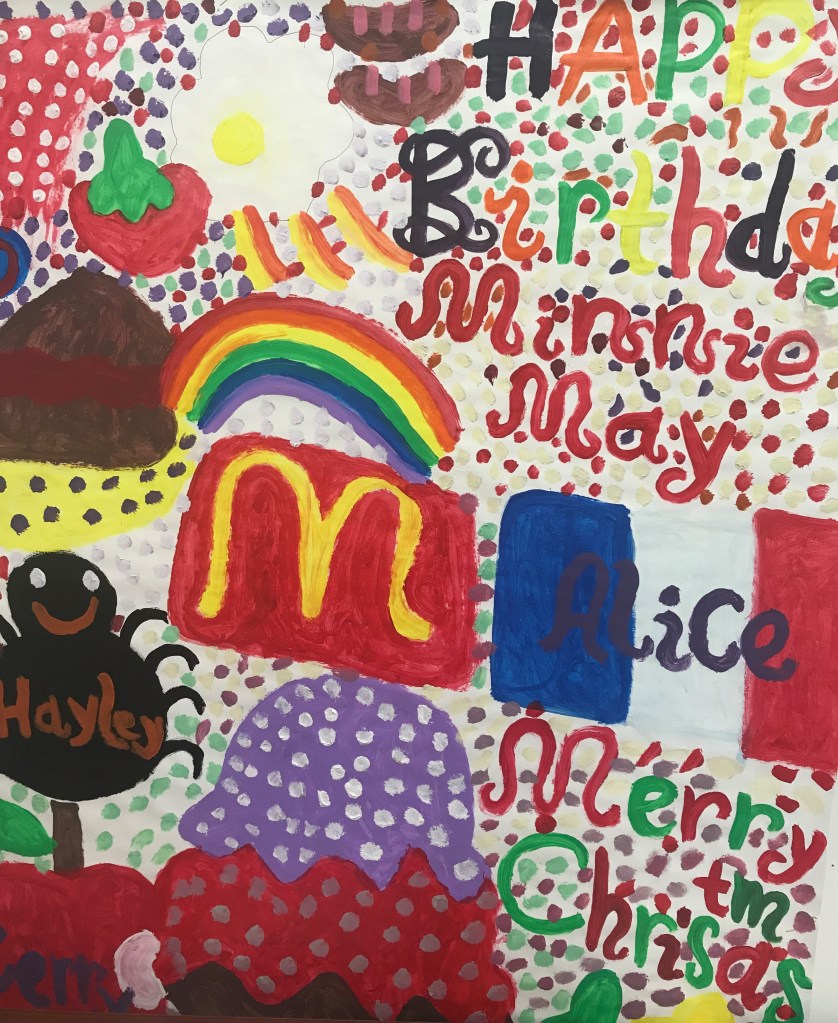 I have made up a story about this painting. It is a story about a character called Minnie May, who celebrates her birthday and goes to Paris to celebrate Christmas with her cousin Alice. All these colours open my eyes. Dots make me think of smarties and chocolate cookies.