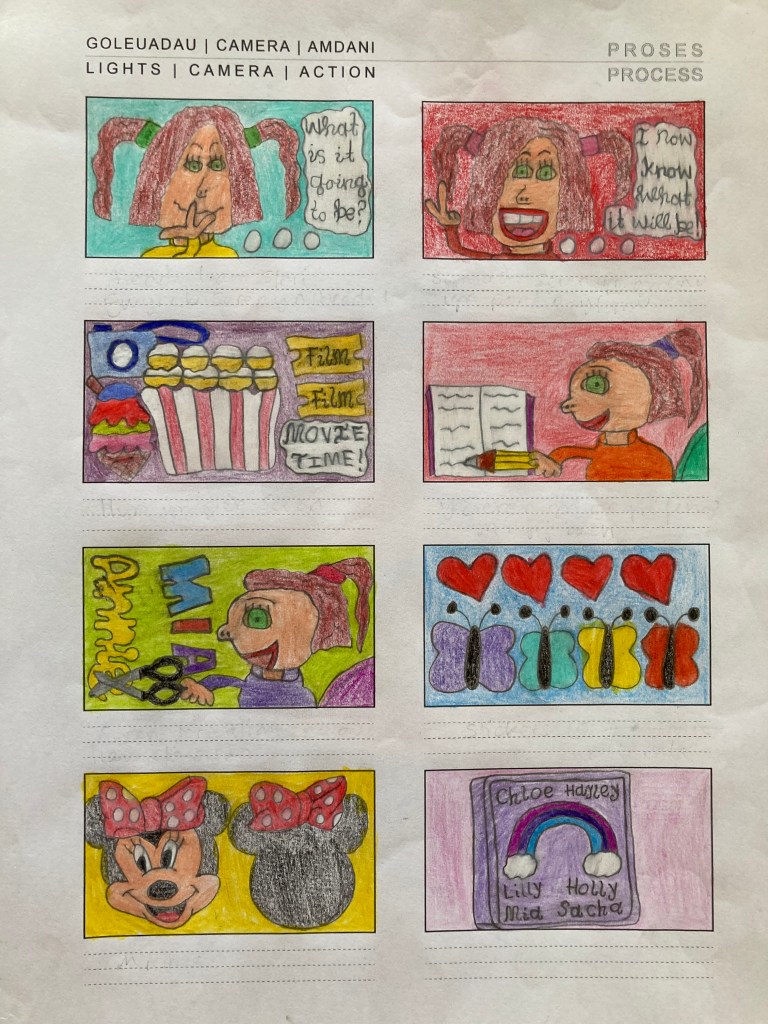 PROCESS – I think about the story. The idea pops into my head, and I have a picture in my mind. The I write about the picture, in the little book, where I write about my character, who they are, what they do and what they like. I cut out the names of my charaters printed out from images that I find on google images and then I glue them into the little book. I don’t like gaps and empty white areas so I cover these with stickers of butterflies, hearts and Minnie Mouse. She is my favourite character because she is always smiling and is pretty.