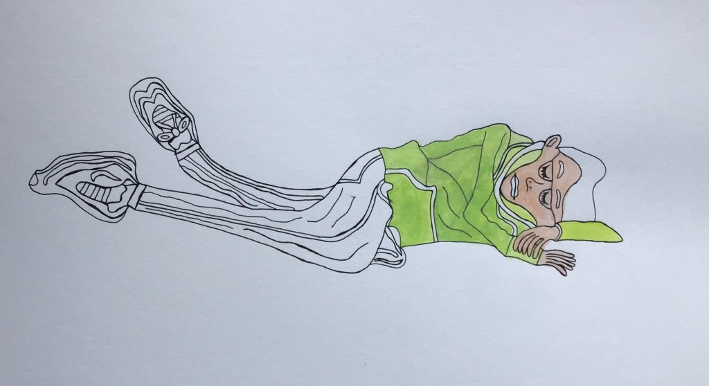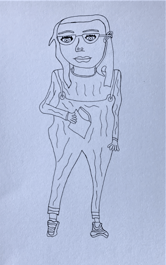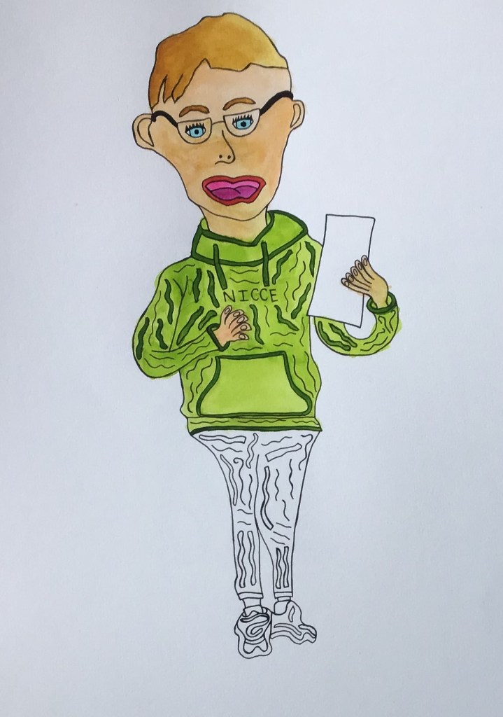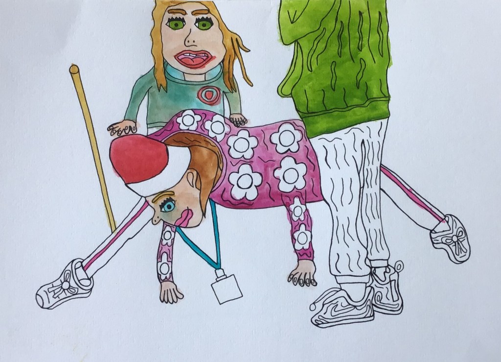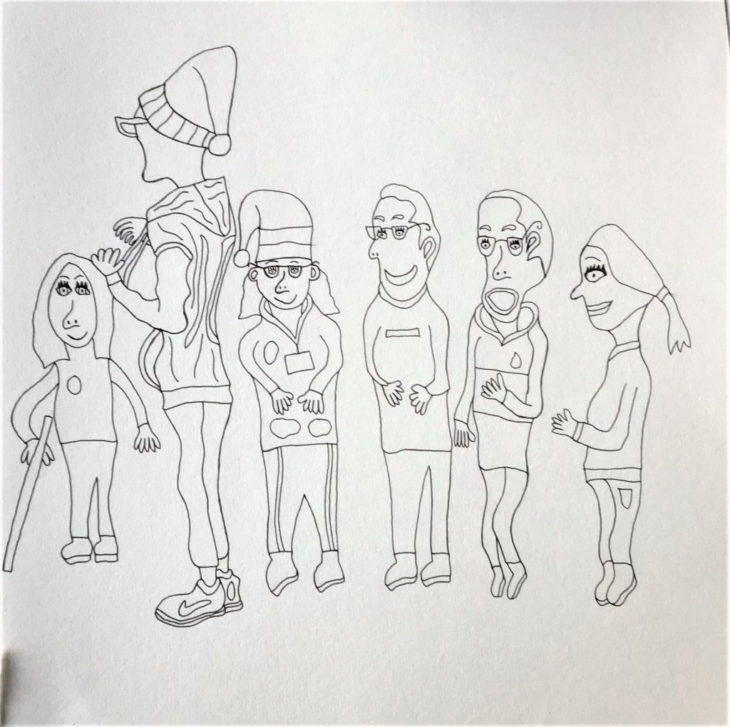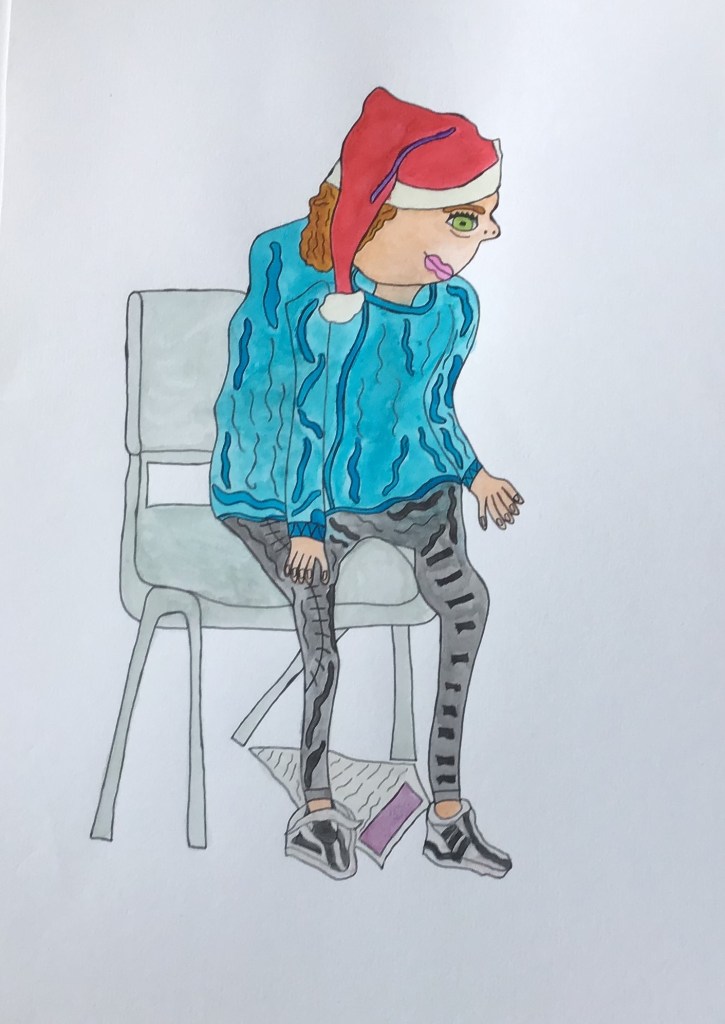 I went to Pontio in Bangor to watch performers practicing for a Christmas show. I took photos of them and drew the pictures below and painted them in with water colour. I didn’t paint it all of it following the suggestion of my tutor. They are different from my usual pictures only partly coloured-in and there is no background, this makes the picture more simple and uncomplicated, the characters become the more significant, unlike my other drawing which have complicated backgrounds with pattern. When I look at them I imagine that they come out of the picture and that they wander about.
