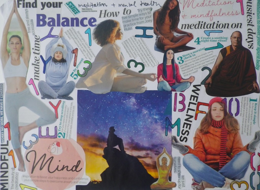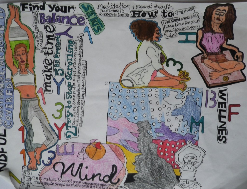 I love this picture the way the people are meditating and closing their eyes and the starts and the words. They are getting peace and quiet. The numbers are for mediation counting. I like everything to be full and no white in the background. Full of inspiration and to inspire people, I don’t like white dots in the background. I put the letters there to fill it up. Meditation is when people think about their favourite things.