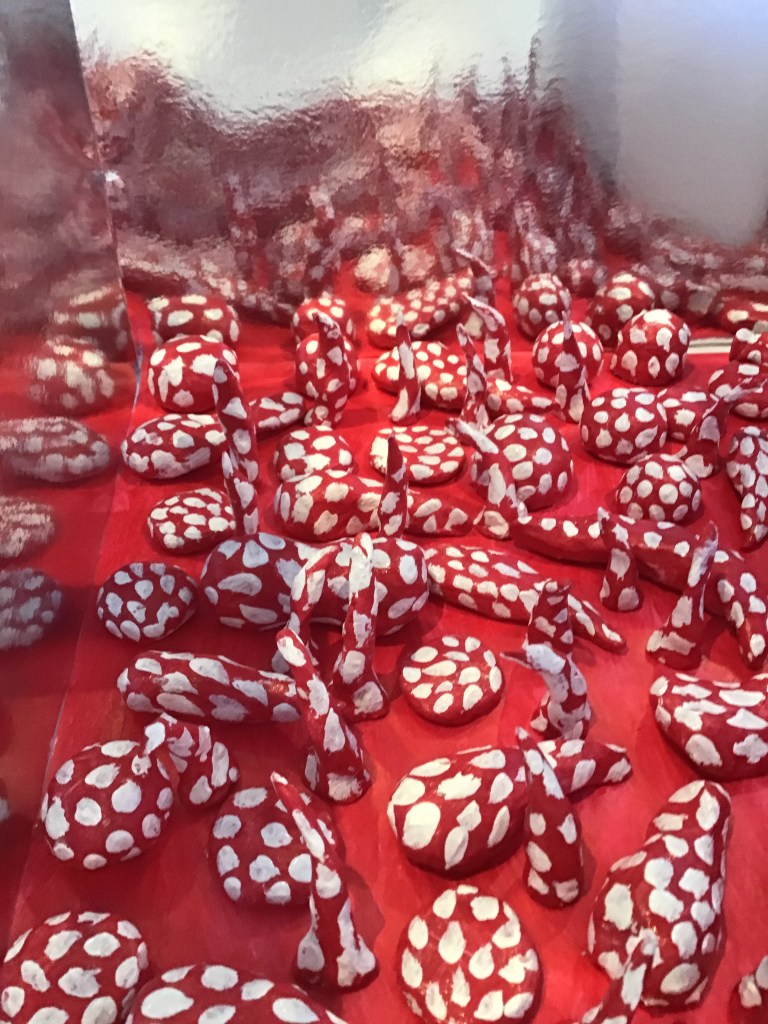 You think that there are more polka dots but then you realize that it is just mirrors. I would stretch my arms out to feel around me and not to bump into mirrors. It is like a maze but it is is fake, it is a dead end. When you walk through you have to be careful not to bump into things. The floor and the balloon like forms and the mirrors are the same because of the polka dots. The polka dots are everywhere, like camoflage – like hidning. I would be hiding in the room if I was covered in polka dots. Yayoi is hiding herself.