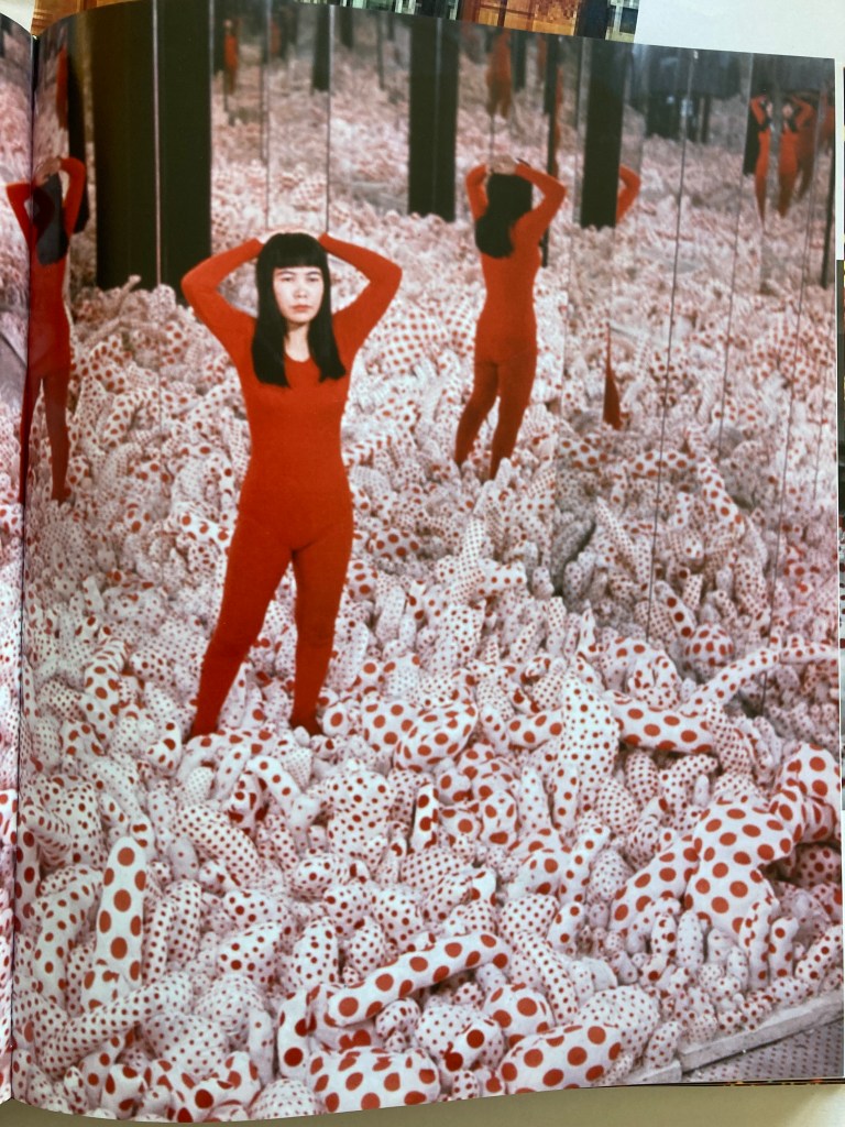 Kusama’s “Dot Obsession” gives the appearance of endless polka dots but then it becomes clear that this is an illusion which is created through the use of mirrors. This leads the viewer to experience a disorienting space that requires care when moving about, requiring outstretched arms to feel around and not to bump into mirrors. It is like being in a maze visually as the balloon-like forms and the mirrors all look the same because of the polka dots which are everywhere. Kusama’s covering herself in polka dots is like a camouflage, almost hiding herself to merge into the background. Perhaps here she transcends physical boundaries and comes to share her world of hallucinations with the viewer.