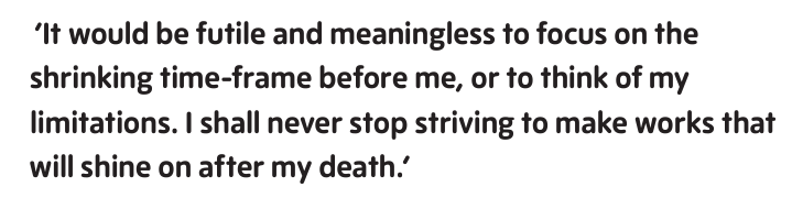 “It would be futile and meaningless to focus on the shrinking time-frame before me’ or to think of my limitations. I shall never stop striving to make works that will shine on after my death.” (Kusama 2021)