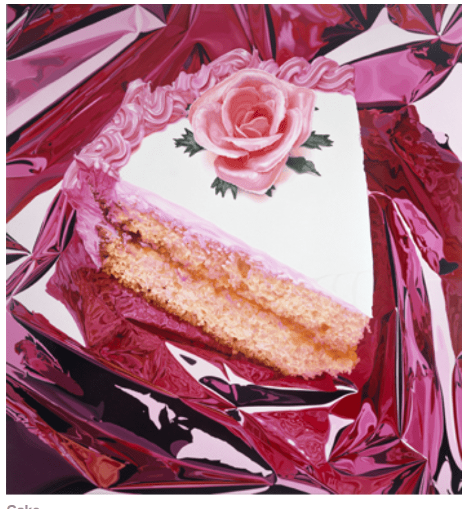 Cake is an oil-painting on canvas and part of TheCelebration series. The series includes paintings and sculptures that reference everyday life such as birthdays, and festive occasions and holidays. Cake is almost photo realistic and symbolises Koons’ interest in past experiences of childhood and reflects memories of an innocent happy early life. Each viewer will have their own personal memories of birthdays and cakes, and this will be reflected in each personal understanding and meaning taken from this image.