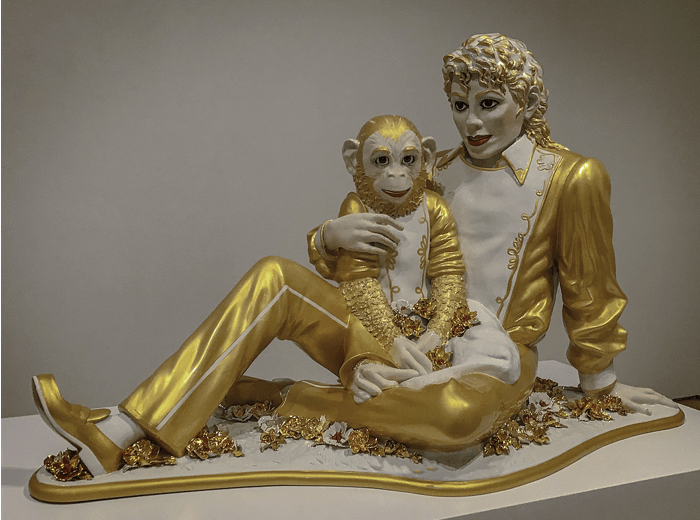 This is a larger-than-life-sized gilded sculpture made out of porcelain. It is based on a press photograph of the pair and is very close to the image. The sculpture shows Michael Jackson reclining on a flower bed together with his pet chimpanzee, Bubbles. They are wearing similar clothing in white and gold and appear as God-like, which could be seen to represent the culture of celebrity worship. Koons denies that there are any hidden meanings behind his work, although the piece could be seen as a religious portrayal similar to the catholic saints figurines often sculptured from gold leaf and porcelain. In this sculpture, Jackson is portrayed like a Greek God whilst in real life, he has actually become immortalised to his fans through his music.