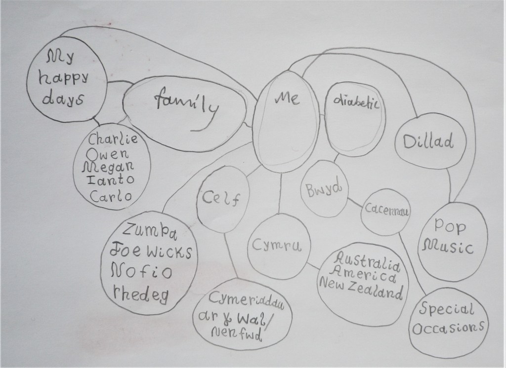 This was my example of showing what Seren’s Mind Map was going to be like just before I was about to fill the whole paper & colour it all in.