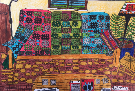 This is a drawing of the sofa that I’ve made & I love it because it looks like there would be more waffle patterns everywhere. There are even patterns on the floor of the living room, & they look like blobs & wiggly lines.