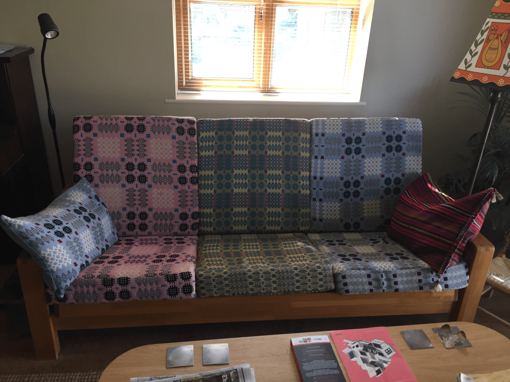 This is our sofa. The textile has been made out of wool through weaving & it has been made in Wales. There are patterns on them all (including one pillow) & I love this picture because it makes me think of something in a book or a film such as Elmer the Elephant. The colours are green, pink & blue & the patterns make me think of a shape of a waffle.