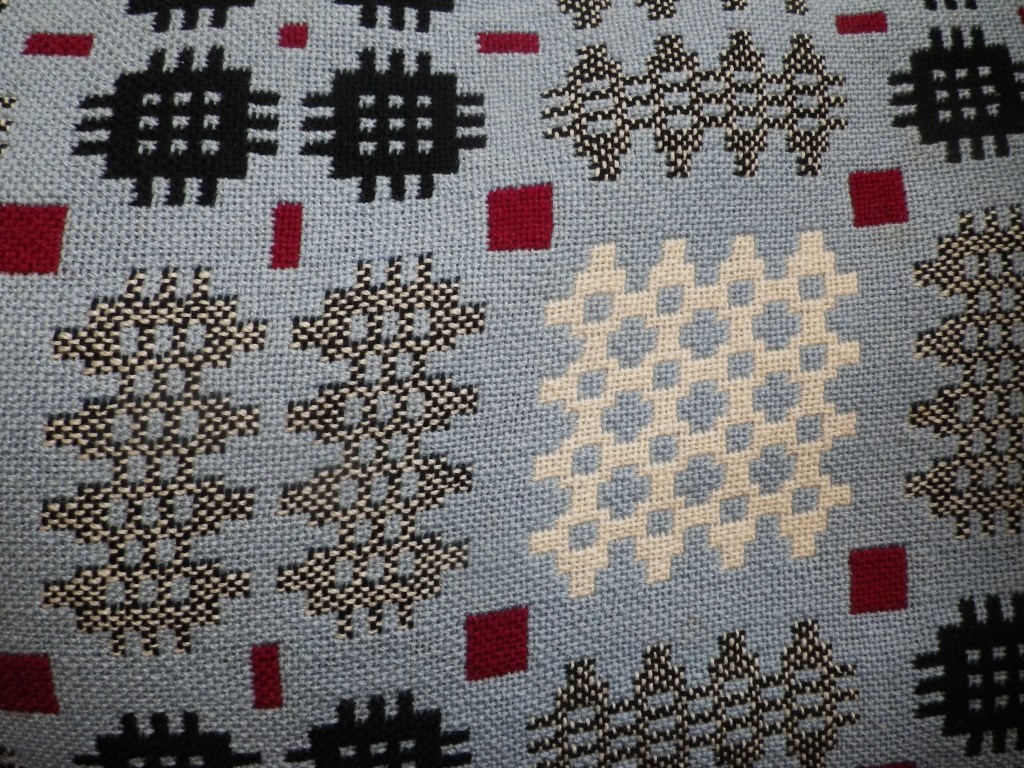 Welsh traditional woolen blankets are unique series of designs, a very old design consisting of a repeated series of pixilated squares, spikes and dots. This was produced in bright contrasting colours – greens, oranges, purples.
